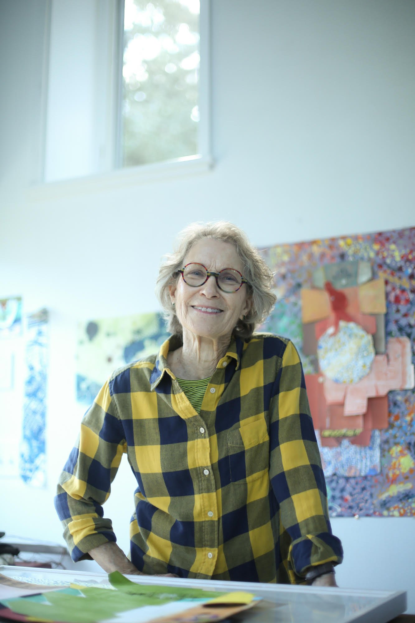 Yvette Drury Dubinsky has a large, airy studio in Truro, but it’s nearly full. Wall space is limited, and it takes some maneuvering to get around her printing press and various tables covered with collage materials and artwork.