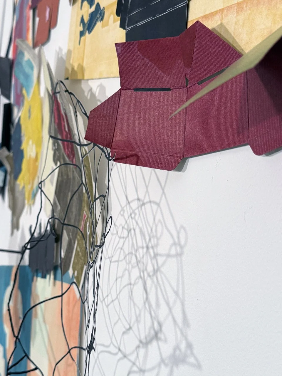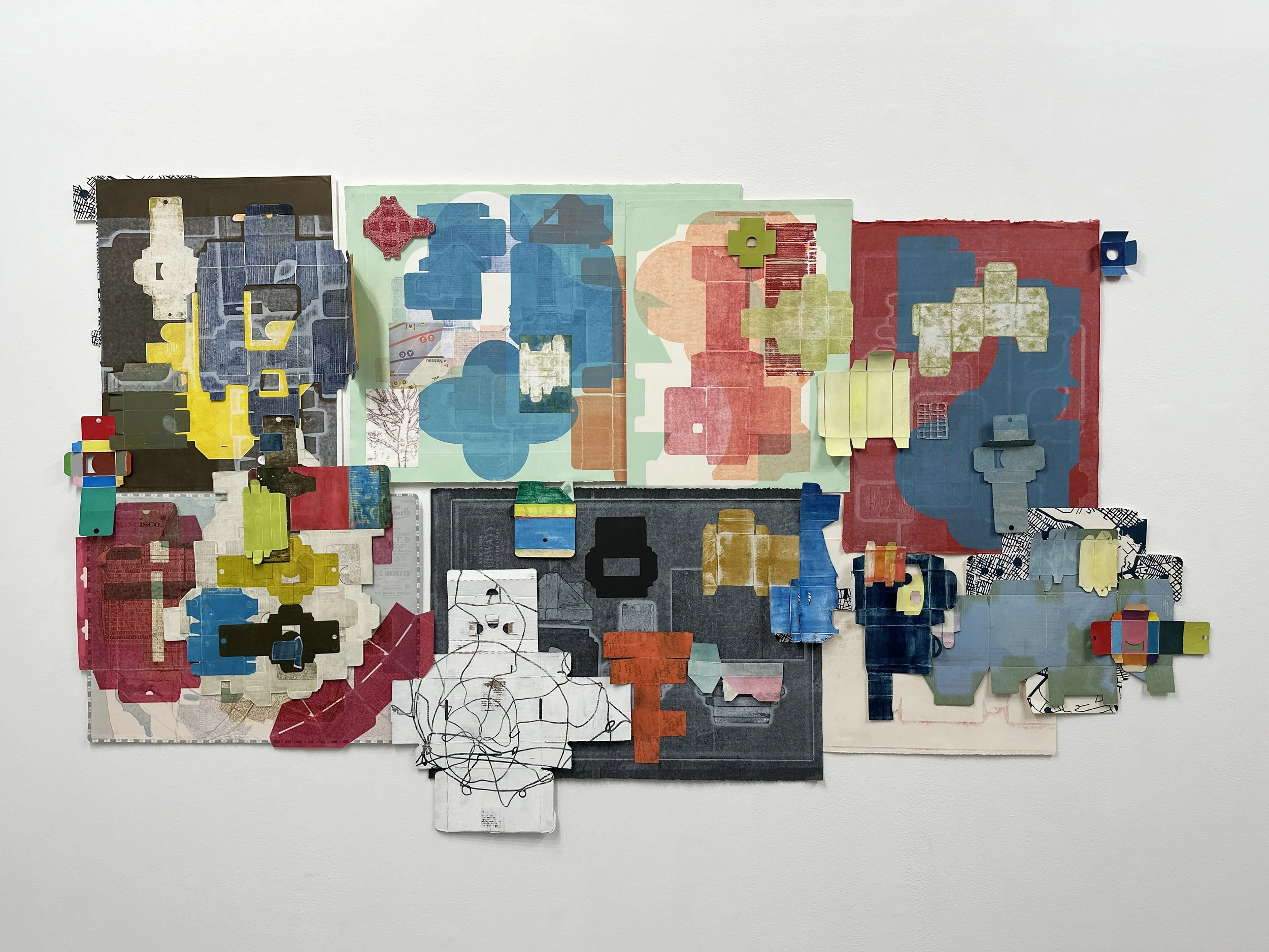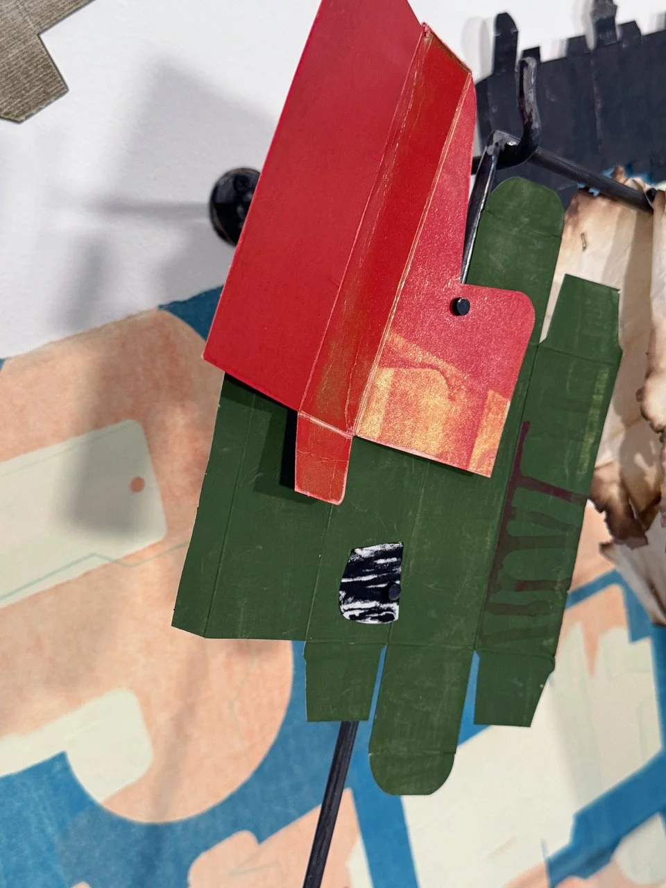 Constructed from painted, printed, and manipulated boxes along with other made and found detritus, the work blends box imagery, oceanic elements, and references to the Outer Cape. The layered composition continues an exploration of place, memory, and the shifting structures of home.